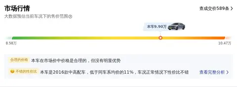 在当前车况下,该车的二手车市场行情最低价为8.58万,本车报价为9.90万,市场最高价为10.47万。