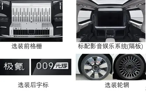 在外观的细节上,极氪009光辉版还是有一些不同的地方,从而能够凸显它的独特地位。在前脸的部分,新车的格栅位置采用的是黑色的装饰,整体采用熏黑,这样看起来风格更加的厚重沉稳一些。车的大灯的风格保持没变,采用的竹节式的方框日行灯,主灯采用隐藏式的效果,风格很凌厉,大灯的内部采用的是串珠式的LED灯带。车的前脸的底部有贯穿式的镀铬条装饰,并且有黑色的格栅。极氪009光辉的车身的侧面和现款车型也有不同之处,它的车轮毂采用的是大饼式的复古设计,周边有齿轮状的连接,看起来很有气场。车的侧面轮廓极其方正,采用悬浮式效果的车顶,采用双A柱设计。
