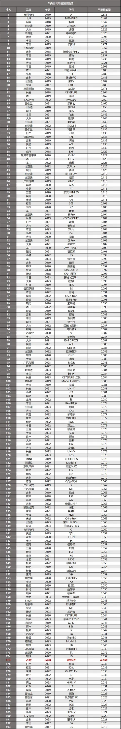座椅的甲醛释放量测量数值为0.008毫克每立方米,顶棚中的甲醛释放量测量数值为0.010毫克每立方米。