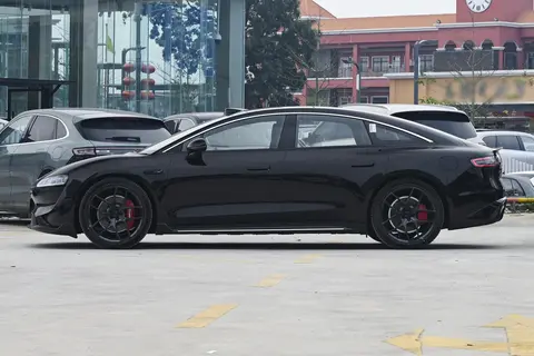 车身侧面,低趴的车身姿态,内凹式的导流口延续到侧面,整体颇有超跑风格。溜背式的造型,隐藏式的门把手,使其风阻系数仅为0.203Cd。并且车轮处配置轻量化21英寸双五辐式轮圈和Brembo刹车卡钳,彰显其运动气息。