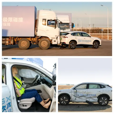安全方面:荣威D5X DMH采用了新一代高强度笼式车身结构,车身高强度钢比例达到了同级最高的79%,超高强度车身占比高达44%,这为车辆提供了坚实的基础防护。外八字载荷路径设计和环抱式上纵梁Shotgun则极大地减少了舱内能量的冲击,有效保护了全车乘客的安全,据实景碰撞测试中,车内的四门保持完整,且气囊全部弹出。除此外还配备了多项主动安全技术,如前方碰撞预警系统(FCW)和自动紧急制动系统(AEB)等。