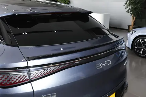 车身侧面同样采用双腰线设计,动感的线条勾勒出海狮07EV优雅的溜背轮廓。在D柱、车顶以及后尾扰流板交汇的部位,线条切割构成了X造型,和整体风格呼应。车身尺寸方面,新车长宽高分别为4830/1925/1620mm,轴距为2930mm。海狮07EV将有两款轮圈造型,分别是19英寸双叉造型和20英寸熏黑五条辐造型。