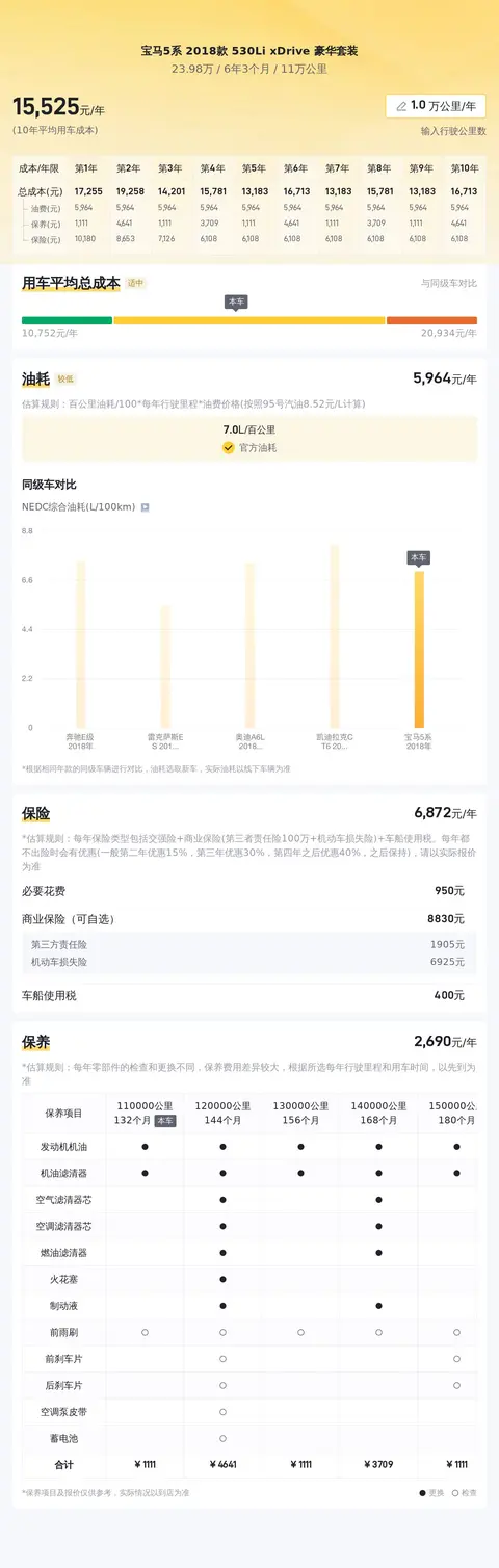随着生活水平的提高,越来越多的人开始关注高端豪华轿车,其中宝马5系(图片|配置|询价)以其卓越的性能和设计成为了许多人的首选。今天我们就为您带来一台二手宝马5系,让我们一起来看看它的综合表现如何。该车的具体版本为——宝马5系 2018款 530Li xDrive 豪华套装,属于中大型轿车类别。该车的初始注册时间为2018年03月,表显里程为11万公里,仅有一任车主,车源所在地也是牌照所在地——成都。新车指导价为49.9万,而现在的二手车报价为23.98万,相比新车便宜了25.91万。