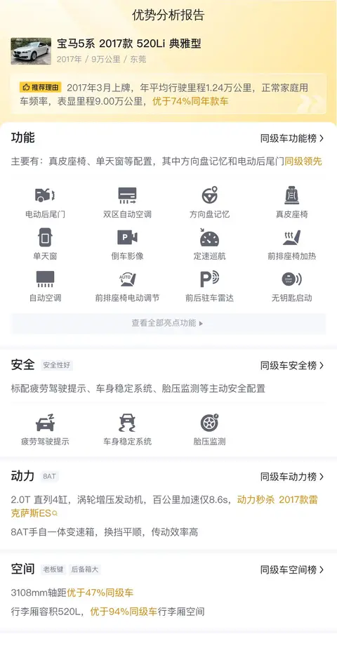 先来看一下该车的基础信息,该车的具体版本为宝马5系 2017款 520Li 典雅型,属于中大型轿车级别,首次上牌日期为2017年03月,目前行驶了9万公里。新车指导价43.48万元,而现在的二手报价仅为13.98万元。值得一提的是,此车目前在东莞售卖,牌照也是东莞的,有过一次过户记录。
