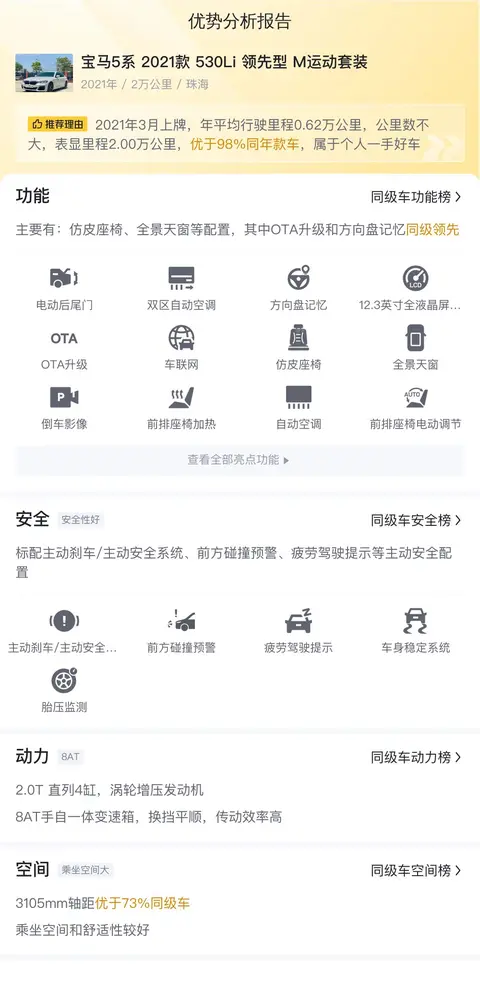 先来介绍一下该车的基本情况,该车的具体版本为2021款的530Li 领先型 M运动套装,定位于中大型轿车,首次上牌时间为2021年03月,目前0过户。车辆所在地和牌照所在地均为广东珠海,当前表显里程为2万公里。这款车型的新车指导价为46.78万,目前二手车报价35.68万。