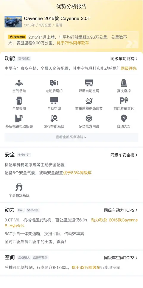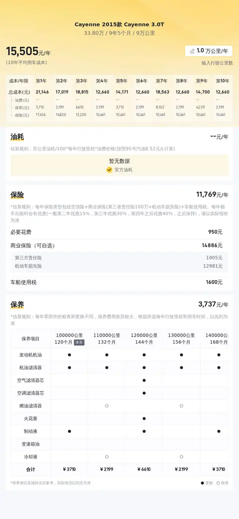 当前市场上,同级Cayenne二手车的价格区间大约在29万至37万左右。关于能耗,NEDC综合油耗已无法准确反映当前车辆的真实油耗水平,因此我们并未列出具体的数字。需要注意的是,每辆车的燃油效率可能会因驾驶方式和使用条件的不同而产生显著差异。