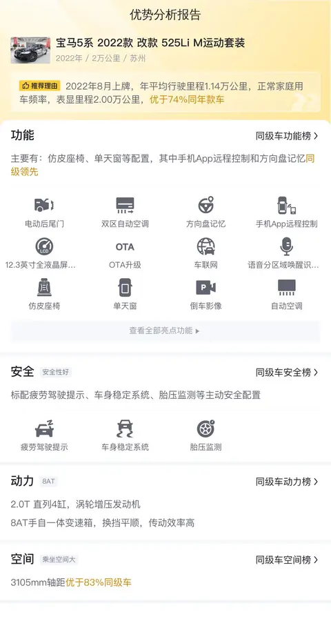 这款宝马5系的具体版本是2022款 改款 525Li M运动套装,定位中大型轿车,2022年8月首次上牌,至今跑了2万公里,江苏苏州牌照,国VI排放标准,目前车源所在地和上牌地均为苏州,有过1次过户。该车新车指导价为43.39万,目前二手车报价32.80万。