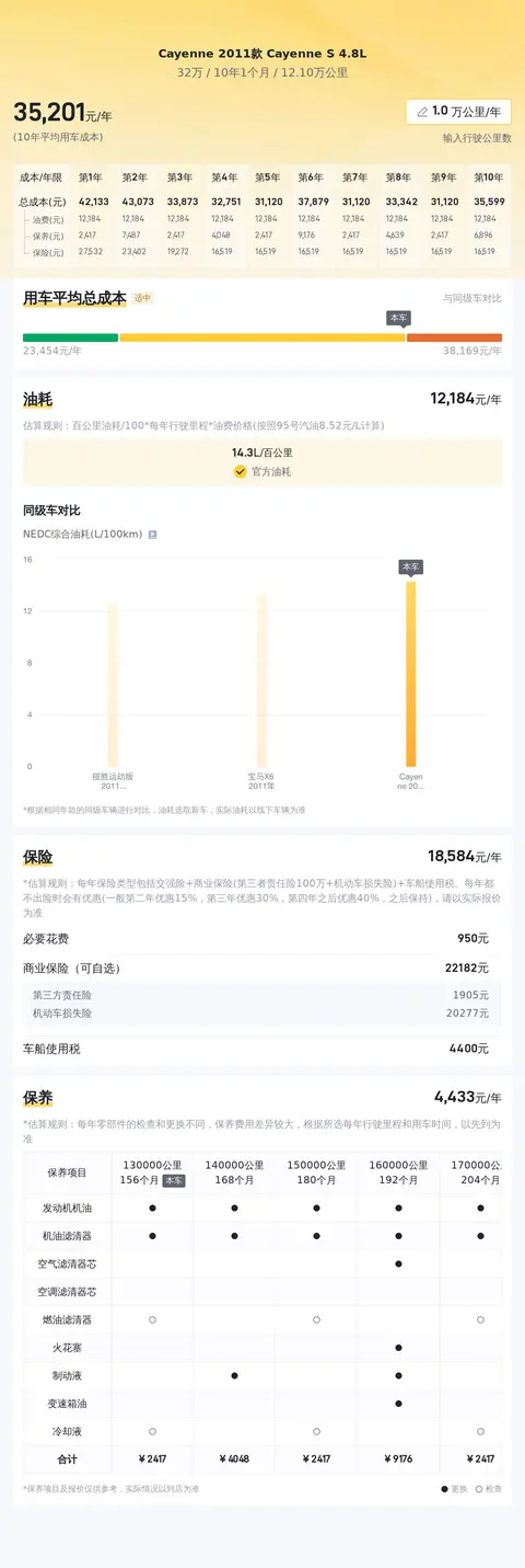 在车辆的使用成本部分,根据估算,这辆车年均综合用车成本大概在每年3.5万元左右。需要注意的是,这项开销可能会随着车主的使用方式与维护情况有所波动。