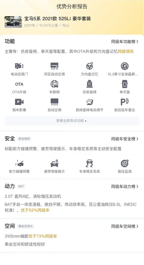 除了了解市场价格和用车成本外,还有一项重要的考量就是车辆的安全性能。这款宝马5系配备了主副驾驶安全气囊、前排侧气囊以及前后排头部气帘,同时还有胎压报警、主动刹车等功能,旨在提供全方位的安全防护。