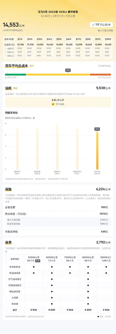 除了了解市场价格,购车后的使用成本也是不容忽视的一部分。根据估算,这辆车年均综合用车成本大概在每年1.5万元左右。当然,具体的花费金额还会受到车主个人使用习惯和需求的影响。