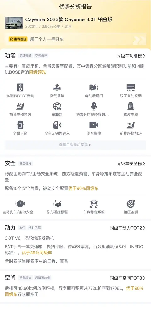 先来看一下这辆车的基础信息,该车的具体版本是Cayenne 2023款 Cayenne 3.0T 铂金版,属于中大型SUV,2023年2月上牌,北京牌照,目前跑了3.9万公里,0过户,车源所在地和上牌地均为北京。