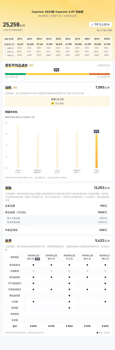 买车不仅要考虑购车费用,也要计算日后的养护负担。据估算,这辆车的年均综合用车开销约2.5万元左右,当然,这个金额会依据车主的实际用车情况有所浮动。