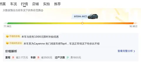 在二手车交易中,每一辆车都有其独特的车况,因此价格也会有所不同。目前这款车型的市场价大约在77万至93万左右,而此车卖家报价86.88万。
