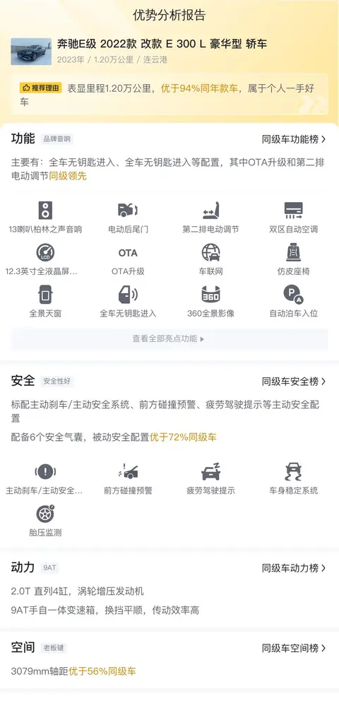 该车的具体版本为奔驰E级 2022款 改款 E 300 L 豪华型,定位中大型轿车,车身采用黑色外观,搭配简洁优雅的线条设计,展现出奔驰一贯的高端气质。该车于2023年7月首次上牌,至今仅行驶了1.2万公里,处于极为良好的车况。此车目前在连云港出售,0过户,车源所在地与牌照所在地均为连云港。该车新车指导价为49.47万元,而现在的二手市场报价为41.80万元,相较新车价格便宜了7.67万元。