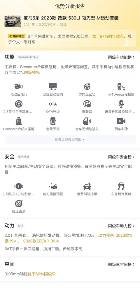 这辆二手宝马的具体版本为2023款改款530Li领先型M运动套装,属于中大型轿车类别,首次上牌时间为2024年1月,截止目前仅跑了0.02万公里。新车指导价为47.55万元,而现在的二手车报价为39.58万元。需要注意的是,这辆车在深圳牌照,但我们将在北京销售。