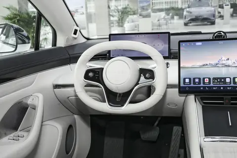 内饰设计就电车那种简约风格了。15.6英寸的大屏幕配了一个扎实的三幅式方向盘。科技感和运动都挺有。车长4971mm,轴距是2950mm。接近3米的轴距,参数是很亮眼的。178cm的个子坐在第二排,腿部空间超过两拳,头部空间超过一拳。这样的空间表现,在同级车型中,可以说是很强的存在了。