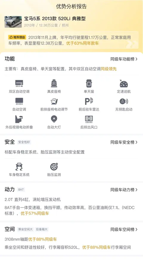 该车的具体版本为2013款的520Li 典雅型。截止到目前,该车跑了12.38万公里,属于中高里程了。该车于2013年11月首次上牌,有1次过户记录。该车为香槟色外观,搭载的是2.0T发动机,匹配8挡手自一体变速箱,目前为国IV排放标准。该车新车指导价为43.86万,如今二手车报价仅为7.80万,相比新车便宜了35万多。