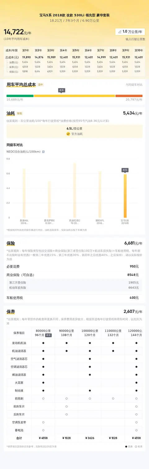在用车成本方面,根据我们的估算,这辆车的年均综合用车成本约1.5万元左右。当然,这个费用根据车主的实际使用情况会有上下浮动的情形。