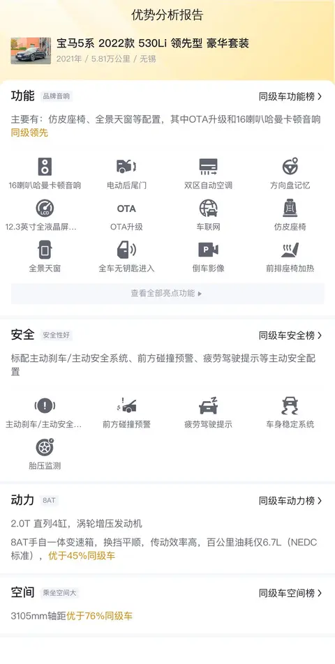 接下来让我们看看这台车的使用成本情况,根据估算,这辆车的年均综合用车成本约1.5万元左右,当然具体的用车成本金额还是跟车主的实际使用情况和驾驶习惯有着直接关系。下面我们将为大家展示一下这辆车在功能配置部分的表现和同级竞品对比的情况。