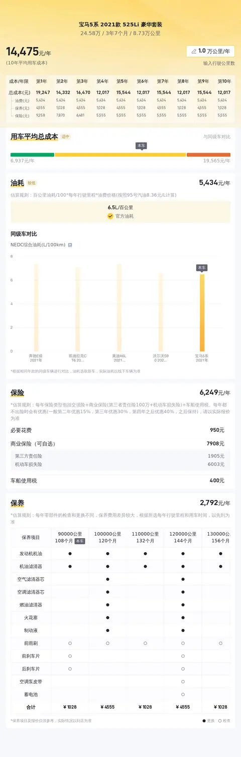 在用车成本部分,根据估算,这辆车年均综合用车成本大概在每年1.4万元左右。当然,这个费用并不是绝对的,具体的用车开销与车主的实际用车场景和强度是有很大关系的。