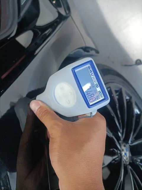 在外观检测部分,经过对汽车主要覆盖件检测,这辆车还是有一些小瑕疵的,具体需要注意的地方为右后翼子的喷漆修复。