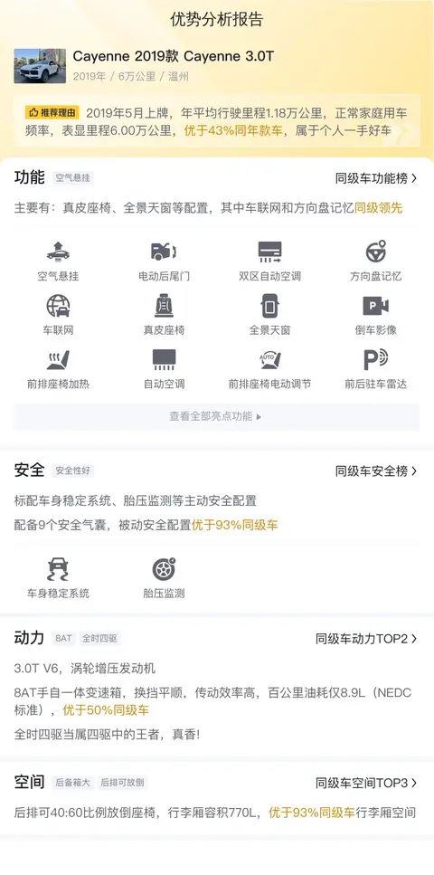 综上所述,这款保时捷Cayenne凭借其出色的性能、丰富的配置和宽敞的空间,在同级竞争车型中展现出不俗的实力。如果您正在寻找一台既实用又奢华的SUV,那么它无疑是一个值得考虑的选择。