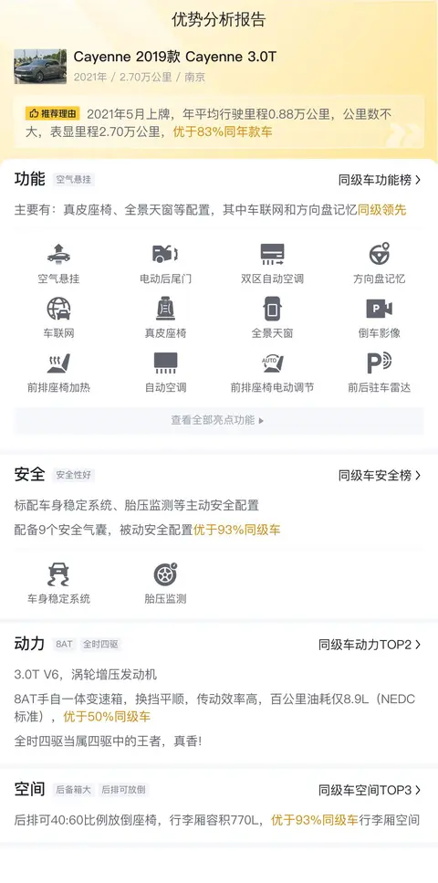 先来了解一下该车的基本信息,这是一辆2019款保时捷Cayenne 3.0T,属于一款中大型SUV,具体版本为Cayenne 2019款 Cayenne 3.0T。该车于2021年5月首次上牌,至今已跑了2.7万公里,江苏南京牌照,有过1次过户记录。新车当年指导价为91.3万,如今卖家报价70.50万。