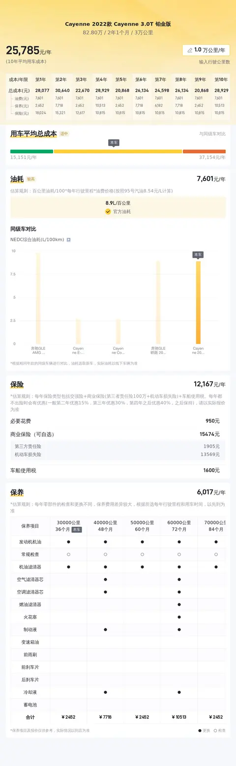 购车预算考量:当前车主的报价为82.8万元。就全国市场而言,此类别的Cayenne二手车价格通常在74万至91万之间浮动。当然,车辆的具体状态——包括里程数、保养历史等因素——将直接影响到最终定价。除了关注行情,别忘了考虑日后的使用成本。据估测,这辆车的年度综合用车开销约2.6万元。