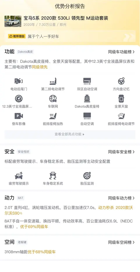 宝马5系(图片|配置|询价)以其优雅的设计、卓越的性能以及豪华的内部配置,在全球范围内享有极高的声誉。自诞生以来,它已成为宝马品牌的象征之一,并不断演变以适应时代的变化。今天我们就为您带来一款二手宝马5系,看看它的表现如何。该车的具体版本是——宝马5系 2020款 530Li 领先型 M运动套装。该车的车身颜色为白色,属于中大型轿车类别,首次上牌时间为2020年07月,目前0过户。跑了7.30万公里,采用 汽油 油耗6.9L,搭载2.0T 252马力 L4发动机,匹配8挡手自一体变速箱,驱动形式 后驱,符合国VI排放标准。该车新车指导价为46.7万,目前二手车报价仅为23.18万,相比新车省了23.51万。车源所在地和牌照所在地均为郑州。