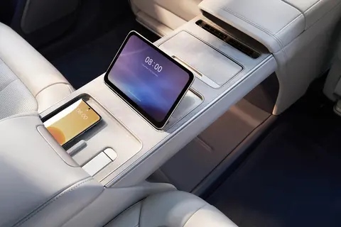 参考蔚来ET9官图,其后排采用2张独立座椅,可以实现最大45度的躺倒角度,并配备16点按摩系统。后排还配备了2块14.5英寸行政屏以及1块8英寸多功能控制屏,并提供行政桌板、10升容积电动开合冰箱、化妆镜等配置。同时,蔚来ET9还提供了“天空岛”和行政桥设计,以及后排7块物理遮阳帘。