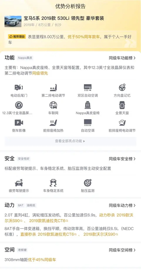 该车的具体版本是2019款的宝马5系530Li 领先型 豪华套装,定位中大型轿车,白色外观,2019年5月首次上牌,目前行驶了8万公里,湖南牌照,0过户,车源所在地和上牌地均为长沙。此车新车指导价46.39万,目前二手车报价23.68万。