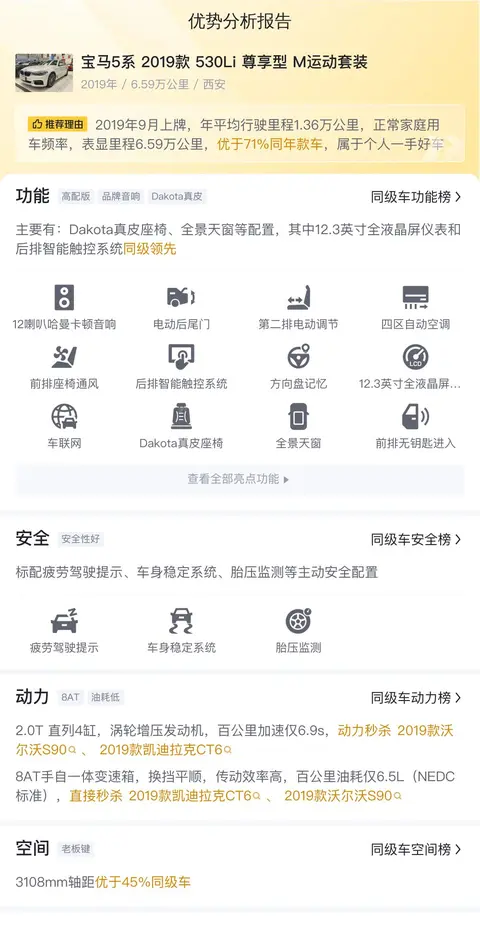 今天我们将为您带来一款备受关注的中大型轿车——宝马5系(图片|配置|询价)。说到宝马5系,它自诞生以来就凭借其出色的操控性能与豪华感深受消费者喜爱。今天我们就来聊聊它的二手车版本,看看这台二手宝马5系是否值得购买。接下来让我们详细了解一下该车的具体情况。该车的具体版本为宝马5系 2019款 530Li尊享型 M运动套装,白色外观,属于5系的中高配车型。该车于2019年9月首次上牌,至今已行驶了6.59万公里。新车指导价为40.69万,而如今二手车报价仅为25.68万,相比之下便宜了25.01万之多。