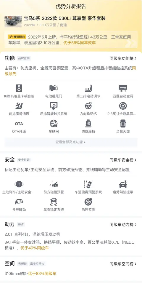 首先,让我们快速了解一下这辆二手宝马5系的基础信息,该车的具体版本是2022款 530Li 尊享型 豪华套装,属于中大型轿车,2022年5月上牌,至今跑了3.10万公里,在江苏南通上牌照,目前车主报价39.80万。新车指导价为50.39万,相比新车指导价,相当于打了8折,比新车省了10.59万。