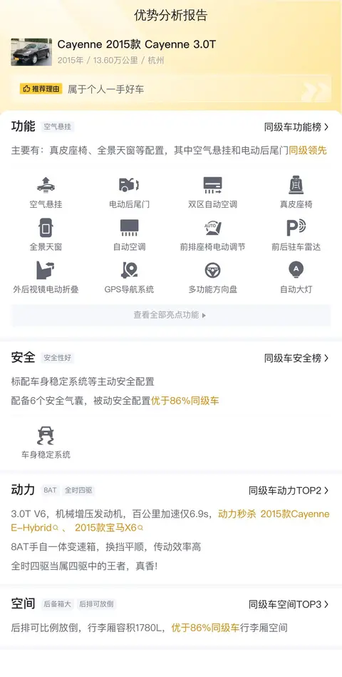 首先我们先来了解一下该车的基本情况,该车具体版本为2015款的Cayenne 3.0T,定位于中大型SUV。该车上牌于2015年的11月,目前在浙江地区售卖,表显里程为13.60万公里。该车的新车指导价为97.20万,而现在的二手车报价仅为27.50万。相比新车省下了69.70万,目前牌照所在地和出售地均为杭州,至今未有过过户记录。