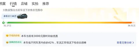 目前这款车的二手车行情大致在31.27万至36.51万之间。然而,要知道的是,每辆车因其车龄、里程和维护情况的不同,最终售价可能会有所差异。此外,我们将为您提供一些已售出的同款车型,以便您进一步了解市场价值。