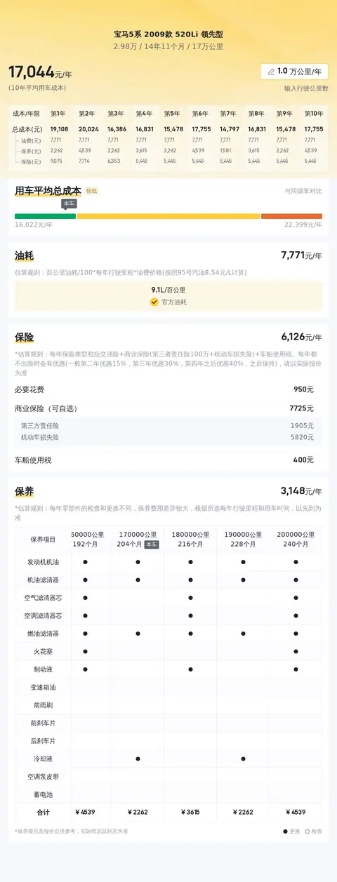关于用车成本,根据我们估算,这辆车的年均综合用车成本约1.7万元左右。然而,这个费用可能会根据车辆的实际使用情况和维护状况产生较大的波动。