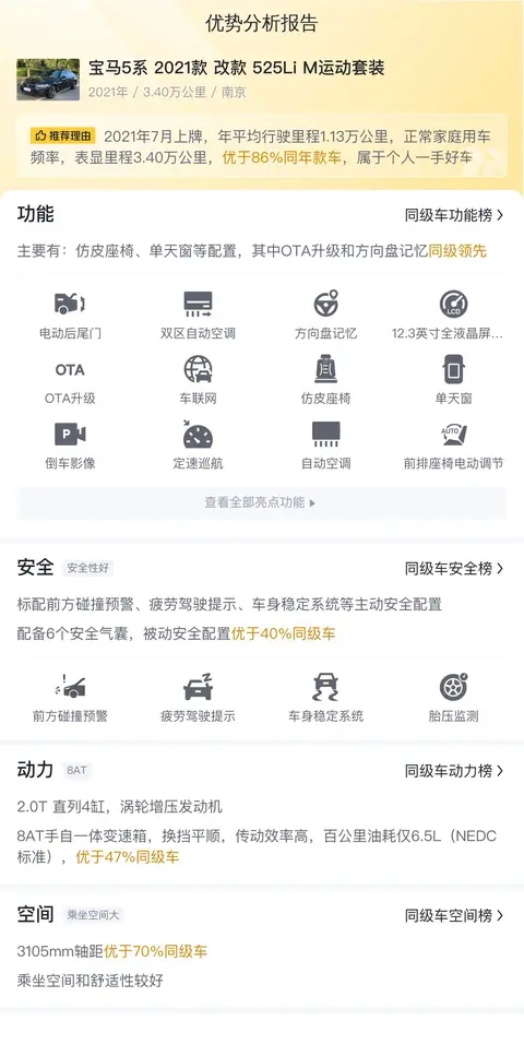 这辆宝马5系的具体版本是2021款 改款 525Li M运动套装,定位中大型轿车,2021年7月首次上牌,目前行驶了3.40万公里,仅过户0次,牌照所在地及售卖地均为江苏南京。此车的新车指导价为42.19万,而现在卖家报价仅为26.99万,相比新车便宜了15万多。