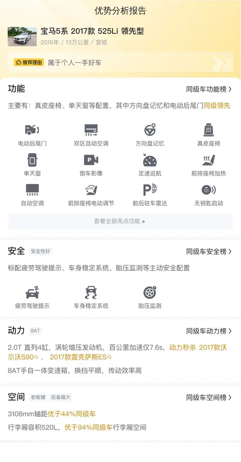 这辆二手宝马的具体版本为2017款的525Li领先型,属于中大型轿车类别,首次上牌时间为2016年10月。该车的车身颜色为白色,至今已行驶了13万公里。新车当年的指导价为43.66万元,如今二手车报价仅为11.80万元,相较新车价格可谓大幅贬值,节省了约34.86万元。