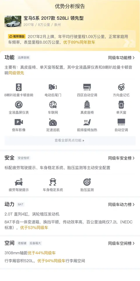 该车的具体版本为宝马5系 2017款 528Li 领先型,属于中大型轿车类别,车身颜色为白色。该车于2017年2月首次上牌,至今已跑了8万公里。值得注意的是,该车上过一次牌照,在北京地区有过一次过户记录。这款车型的新车指导价为49.66万元,而现在的二手车报价仅为14.58万元,相较新车价格便宜了约40万元之多。