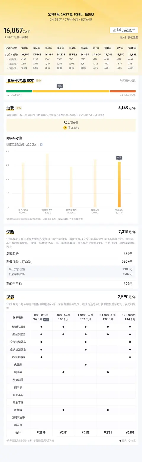 在用车成本方面,根据估算,这辆车的年均综合用车成本约1.6万元左右。需要注意的是,这个费用会根据车辆的实际使用情况有所变动。