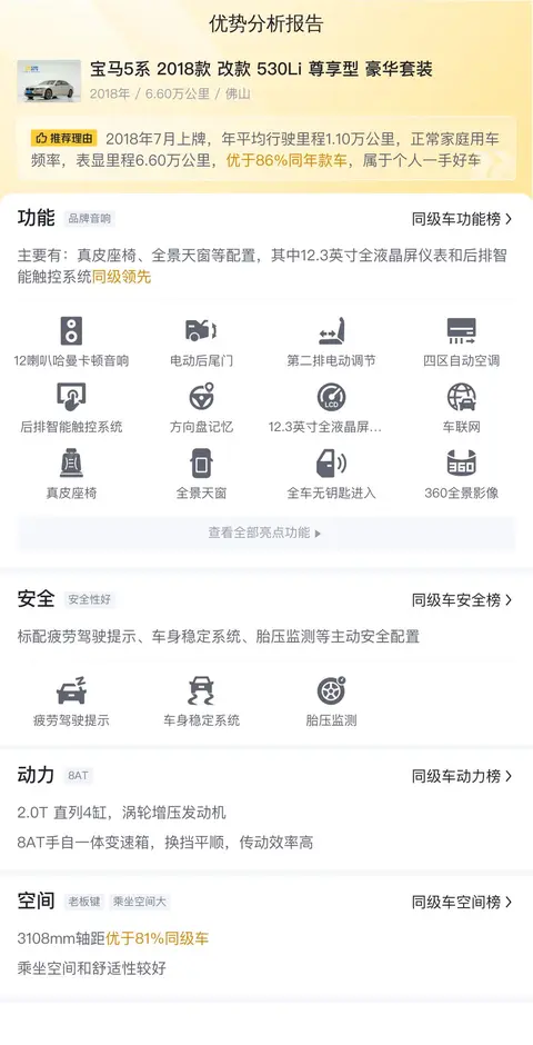 这辆宝马5系的具体版本是——宝马5系2018款改款530Li尊享型豪华套装,定位中大型车,香槟色外观,浅色内饰。2018年7月首次上牌,牌照及车源所在地均在佛山,没有过户记录。目前表显里程6.60万公里。新车指导价为51.99万元,目前二手车报价22.68万元。