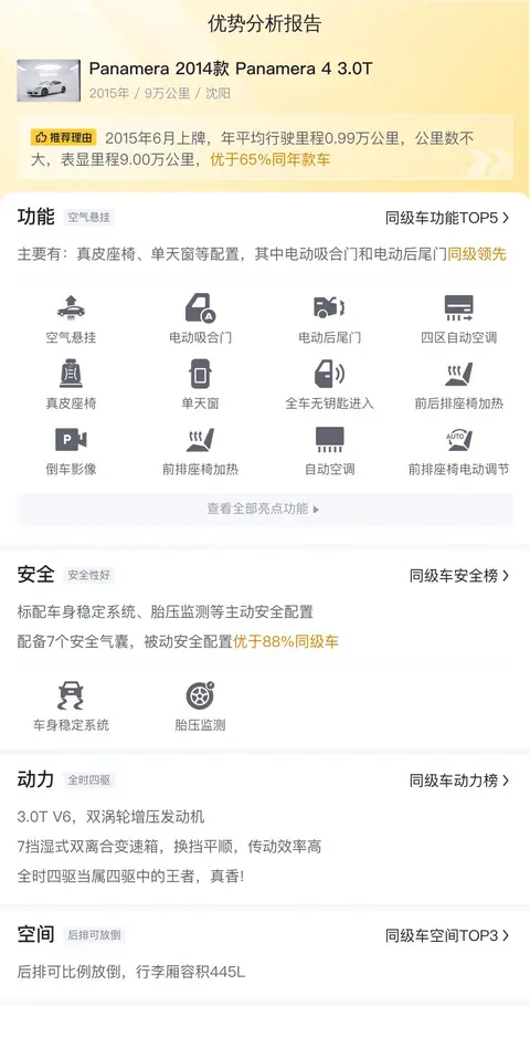 目前这款二手保时捷Panamera的二手车行情大致在30.54万至39.10万之间,而此车的报价正好处于市场行情的较高价位,说明它的车况良好,性价比不错。根据估算,这辆车年均综合用车成本大概在每年3.2万元左右。