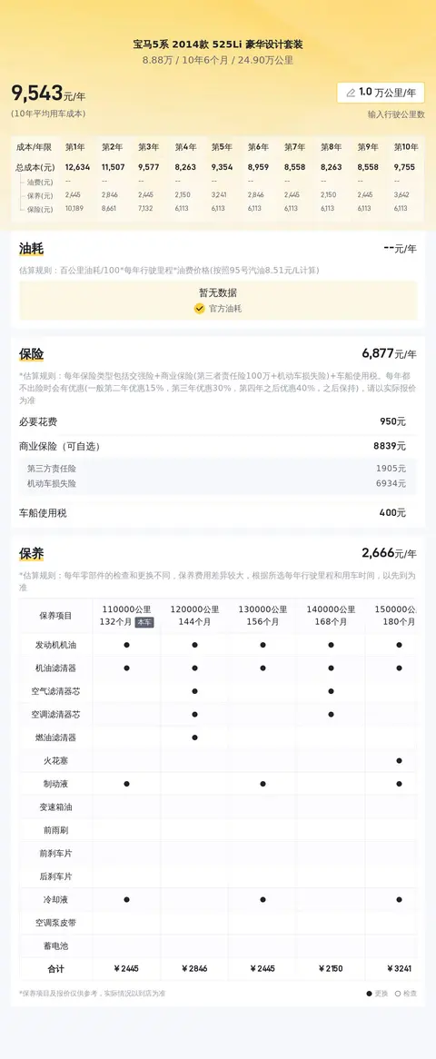 当前市场上,这款宝马5系 2014款 525Li 豪华设计套装的二手车行情大致在7.40万元至9.53万元之间。具体的价格因车况而异,建议实地看车时综合考虑。此外,该车的10年平均用车成本约为1.7万元/年,但实际费用会根据用车强度和环境等因素有所变化。