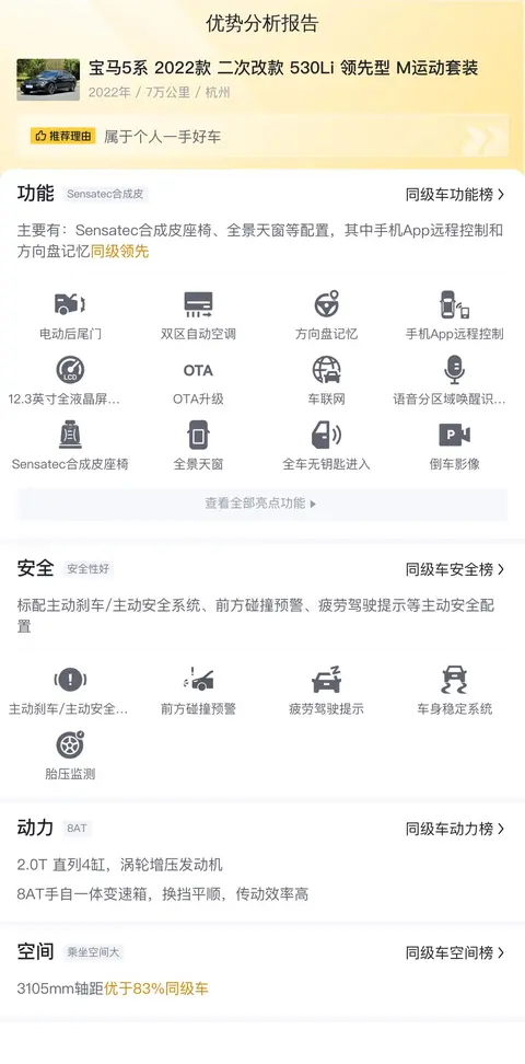 这款宝马5系2022款二次改款530Li领先型M运动套装,截至2024年6月底累计行驶里程7万公里,该车符合新能源指标置换,目前市场行情26万至31万,而这款二手车报价28.80万,价格处于适中水平。
