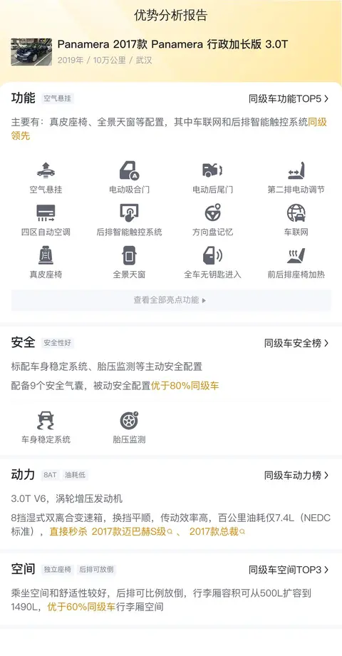本次介绍的是一辆Panamera(图片|配置|询价) 2017款 Panamera 行政加长版 3.0T,属于大型车类别。该车于2019年3月首次上牌,上牌地为武汉,至今已行驶了10万公里,目前二手车报价66万元,相比新车指导价113.80万元,便宜了47.80万元。该车有1次过户记录。