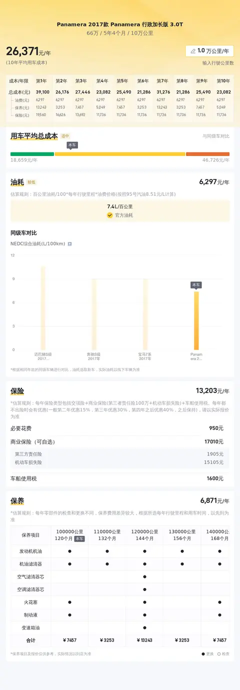 说到豪华车,除了性能和配置,用车成本也是不容忽视的。根据估算,这辆车的年均综合用车成本约为2.6万元。当然,具体费用会因个人使用习惯和环境而有所差异。