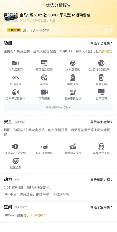 这款宝马5系 2022款 530Li 领先型 M运动套装是一款性能卓越、配置丰富的豪华中大型轿车。它搭载了2.0T 252马力 L4发动机,配合8挡手自一体变速箱,为驾驶者提供了出色的驾驶体验。同时,该车还配备了丰富的科技配置,如12.3寸全液晶仪表盘、仿皮座椅、全景天窗等,为乘客提供了更加舒适便捷的乘坐体验。此外,该车还具有良好的安全性能,配备了多项主动安全配置,为驾驶者和乘客提供了全方位的安全保障。如果您正在寻找一款性能卓越、配置丰富、安全可靠的豪华中大型轿车,那么这款宝马5系 2022款 530Li 领先型 M运动套装绝对值得您考虑。