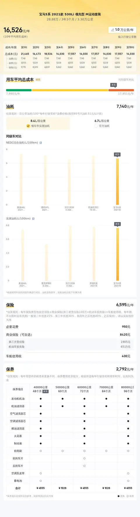 目前市场上这款宝马5系的二手车行情大致在29.97万至35.42万之间,而此车的报价低于市场价,性价比较高。在用车成本方面,按一年行驶一万公里计算,平均每年燃油、保险及保养的费用约1.6万元,十年平均每年1.5万元,十年之后平均每年2万元。当然,具体的用车成本还需根据车辆的使用情况而定。