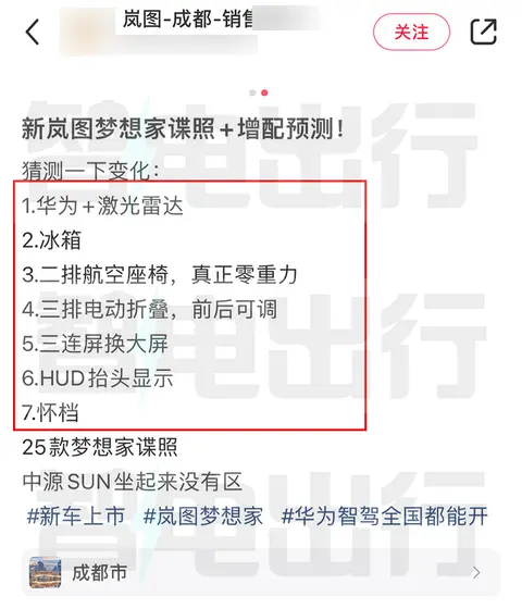 岚图某体验中心销售透露,新梦想家将搭载华为乾崑ADS 3.0,升级冰箱、二排航空座椅、三排电动折叠+前后可调、HUD抬头显示等。