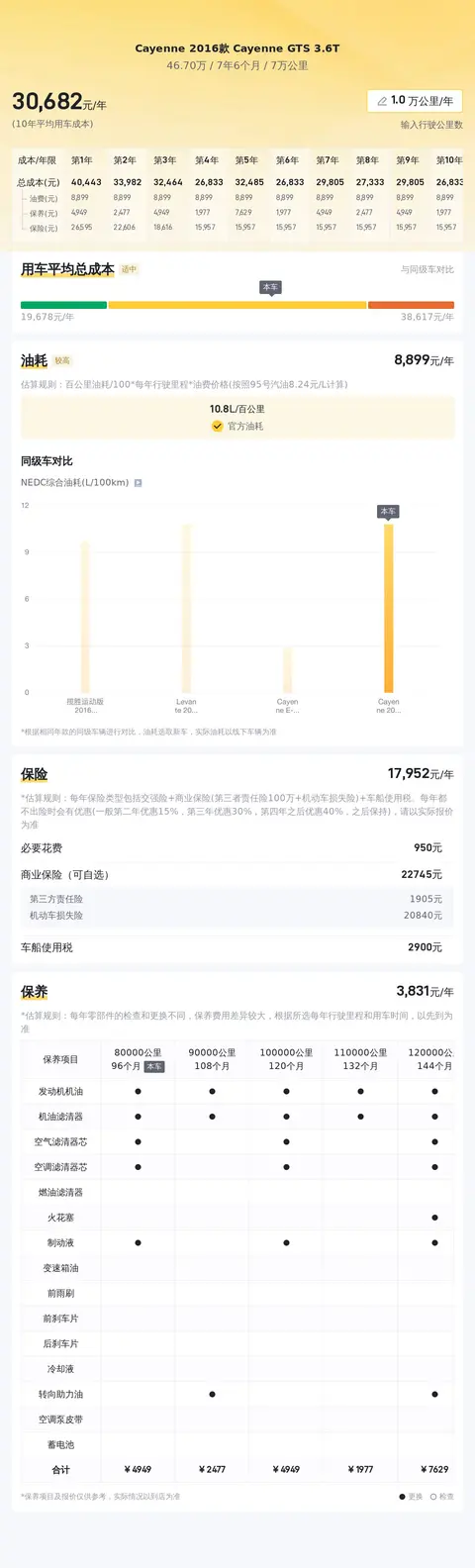 在用车成本方面,基于大数据分析,这款Cayenne GTS 3.6T的年均使用成本大约在3万元以上。这一数字涵盖了燃油、保险以及保养等常规开支,但具体金额还需根据个人使用习惯及车况维护情况做适当调整。尽管成本相对较高,但对于追求卓越性能与豪华体验的消费者而言,这样的投入无疑是物有所值的。